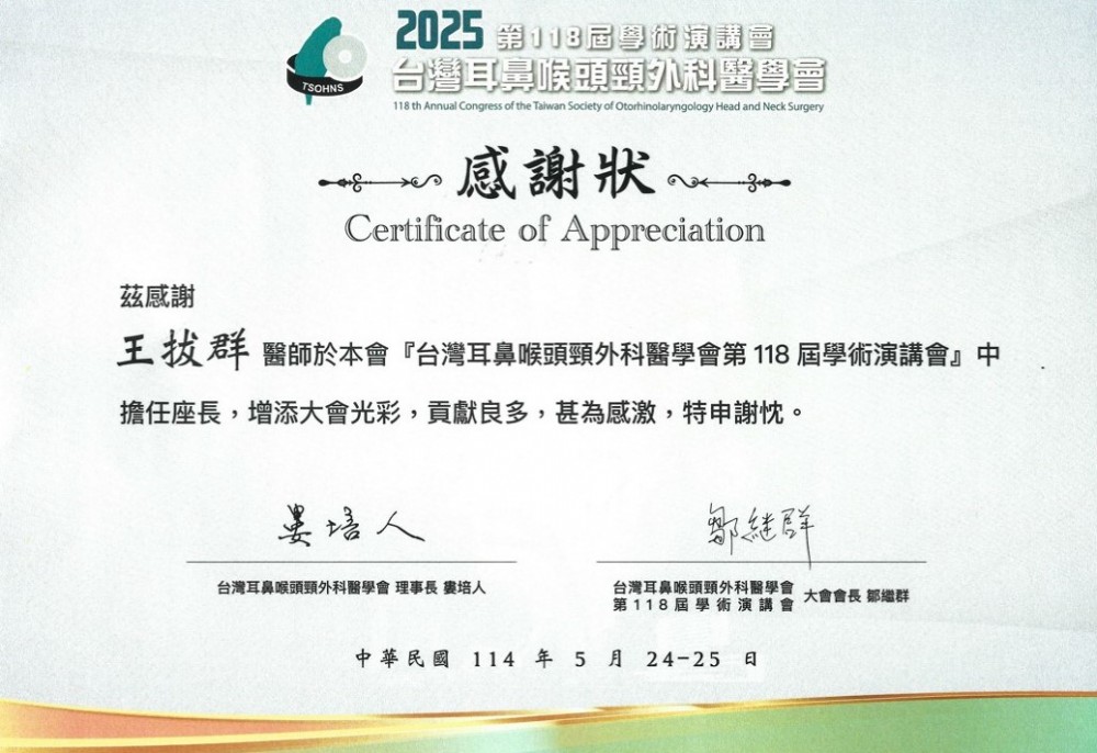 王教授受邀擔任台灣耳鼻喉頭頸外科醫學會第118屆學術演講會座長